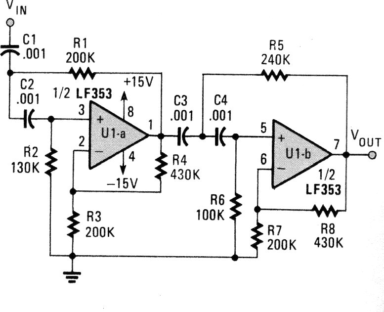 We found this circuit in a Poptronics from the 90's. Equivalent operational amplifiers can be used. The circuit must be supplied by a symmetrical source.