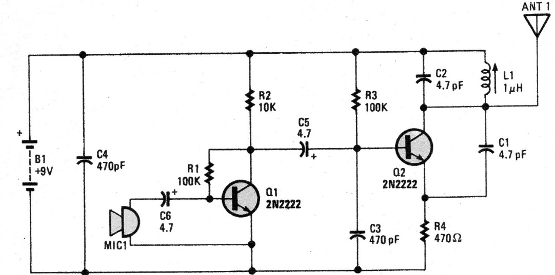 We found this circuit in a 1979 Poptronics. The coil is formed by 5 turns of wire 28 in an adjustable 0.5 cm ferrite core and the antenna is 12 to 30 cm long. The microphone must be piezoelectric, and the capacitors are ceramic.