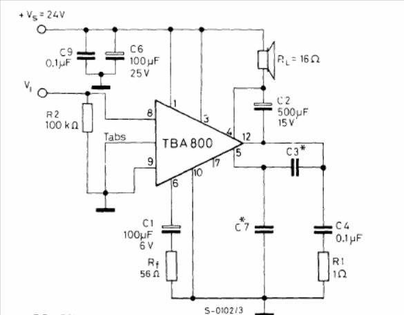 This circuit has the load connected to the positive of the source providing 5 W of power in 16 ohms. The circuit is from the SGS linear integrated circuits manual. Capacitors C3 and C7 typically have values between 10 and 100 nF.