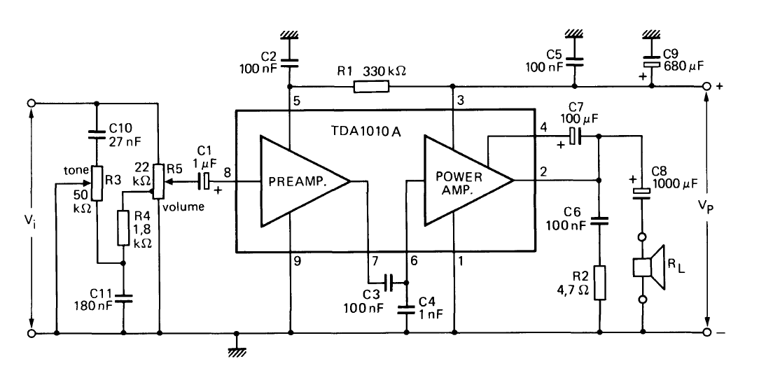 This circuit was obtained in the Philips integrated circuits manual of 1990. The indicated power is 14.4 V, and the power depends on the load that can be between 2 and 16 ohms.