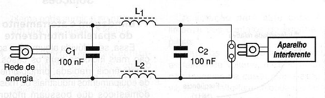 If interference occurs in several receivers, much more interesting than placing a filter on each interfered device is to use only one between the interfering device and the power network. We can use the two previous configurations for this purpose, connecting them as shown in figure. In this case we should only note that normally the interfering devices can have high powers, in which case the coils must be wound with thicker wires. Use wire 14 for power up to 500 W and 12 for power up to 1000 W.