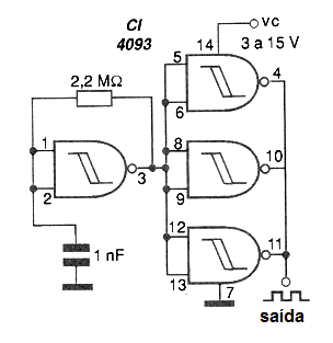 CMOS integrated circuits are sensitive to supply voltages in terms of signal propagation time. Thus, we can take advantage of the variation of the signal propagation time in a port, to include it in the feedback circuit and thus, control its frequency. This is done in the circuit shown in the figure where we can have frequency over a wide range of values ​​when we vary the supply voltage between 3 and 15 V. In this range of values, ​​the frequency will typically vary between 450 Hz and 5 kHz when the control voltage (Vc) travels from 3 to 9 V. With 15 V this frequency will be close to 50 kHz. The central value of the generated frequency depends on the capacitor and its minimum value is around 50 pF. The resistor can also be reduced to achieve even higher frequencies. It is important to note that the output signal is rectangular, but as the circuit is powered by the control voltage, its amplitude varies with frequency. The lower frequency signals are less intense. This problem can be solved with the use of an external buffer powered by a fixed voltage.
