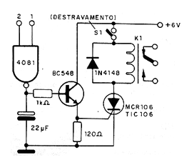 The simultaneous presence of signals at inputs 1 and 2 of this circuit causes their trip and lock. The relay then remains docked, feeding or disconnecting an external load. To obtain the desired function, one of the 4 NAND ports with 2 inputs available on a CMOS type 4081 integrated circuit is used. The relay is 6V low current, but relays of other voltages can be used if they have tripping currents up to 50 mA. The 22 uF capacitor determines the coincidence time range for the trip, avoiding the action of transients. Depending on the operating range of the system, this capacitor must be changed and can be in the range of 100 nF to 100 uF.