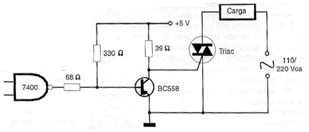 The purpose of this circuit is to interface a TTL system with a TRIAC controlling a power load connected directly to the power grid. Note the need for a common negative pole for the high and low voltage circuit.
