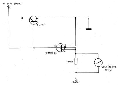 The movement of the indicator needle indicates when something or someone approaches the sensor, an antenna that is a simple stretched wire. The indicator can be the voltage scale of 10 or 15 V of the multimeter. The circuit is powered by a 9 V battery. The transistor collector, which may be a BC548, must remain off.