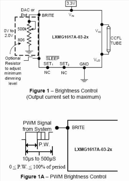 The circuit shown in the figure consists of an Inverter Module for CCFL Lamp that can be supplied with voltages of 3.3 V. The circuit is suggested by Microsemi (www.microsemi). Brightness control can be done either by a PWM signal or via a potentiometer. Per potentiometer, the circuit shown in figure 10 is used. For this circuit, the module already has a pull-up resistor of 215k ohms. The complete documentation for preparing projects can be downloaded directly from the Microsemi website. Other features that this module has are sleep mode and an input to turn the module on and off from an external command signal. Other versions of the same module for different operating voltages are available.