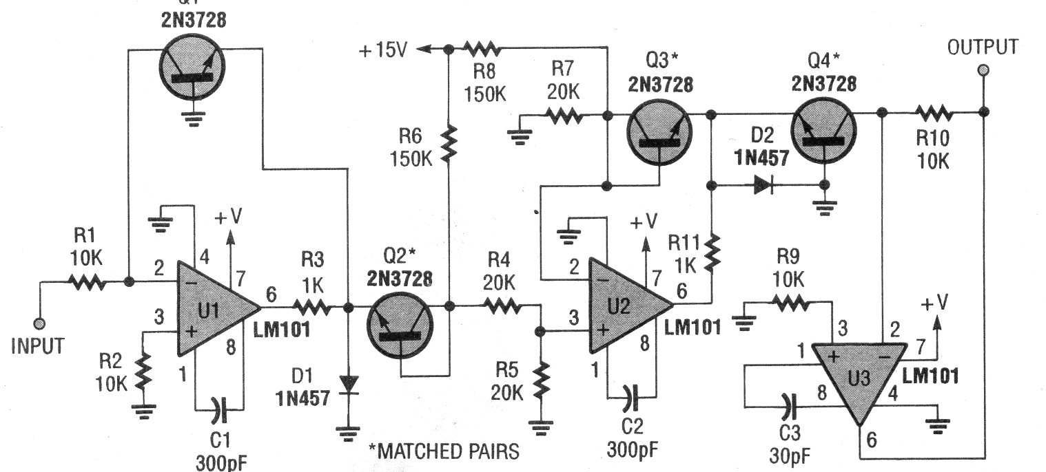 The output voltage of this circuit is proportional to the square root of the input voltage. Equivalent transistors and operational amplifiers can be used. We found this configuration in an American documentation from the 90s.