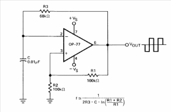 The oscillator shown in the figure generates a rectangular signal with a 50% active cycle (square) whose frequency depends on the components used, according to the formula given next to the diagram. We obtained this circuit in the manual of linear integrated circuits from Analog Devices. With the values indicated for the components, the frequency is 1 kHz, and the signal amplitude is 2 V.