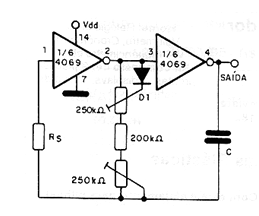 Two inverters of a 4069B type CMOS integrated circuit form this oscillator which is characterized by having an active cycle adjustment. The components Rs and C determine the operating frequency of the oscillator which must be within the limits of the 4069B on the order of 1 MHz for a 5V supply. The control of the active cycle is done according to the D1 diode that determines the capacitor discharge without going through the 250 k ohms trimpot. The other 250k ohm trimpot is used to compensate for the frequency variations that can occur with the change of the active cycle. Other trimpot values can be used.