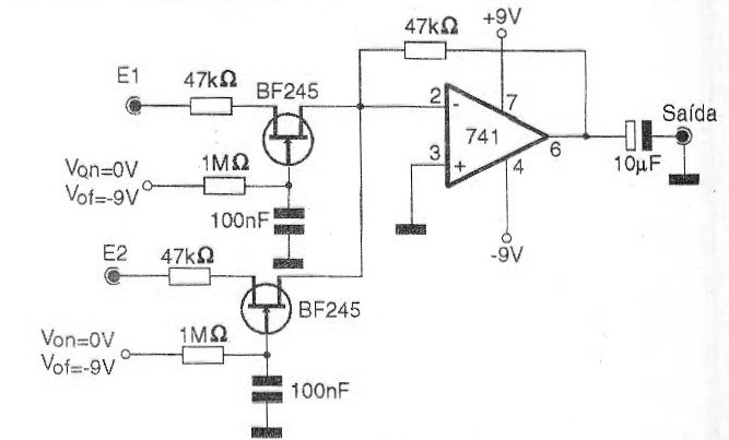This shield circuit can serve as a basis for a digital mixer or simply for a switch without noise from audio inputs on a mixer, mixer or even on an experimental radio station. The switching of the audio sources in the circuit of the figure is done by applying continuous voltage to the gates of the field effect transistors. Transistors conduct or do not conduct audio signals, as appropriate, applying them to the unit gain operational amplifier. Note that the power supply must be symmetrical and that it is the 47k ohms resistor between the output and the inverting input (pins 6 and 2) that determines the circuit gain. This resistor can be changed, depending on the application. Of course, other operational amplifiers and other field effect transistors can be tried. An interesting point of this assembly is that the transistors can be connected in any way in relation to the drain and source terminals, as the current circulates in both directions when driving. For a digital mixer, for example, the complementary signals of a digital oscillator that must operate at a higher frequency than the audio cut-off are applied to the switching inputs.