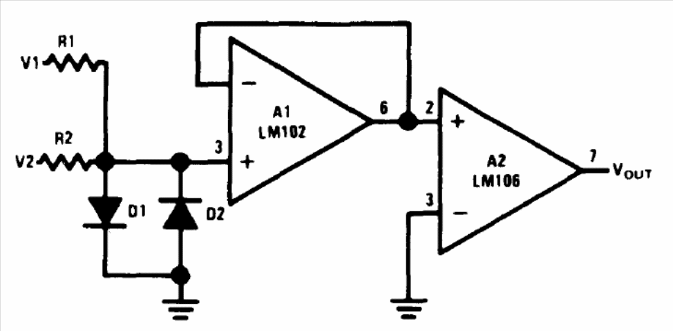 In the figure we have the way to implement a comparator for voltages of opposite polarities. The circuit can be designed with more modern operators, as it was found in the Linear Applications Handbook of the National Semiconductor of 1994.