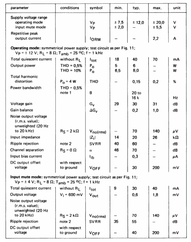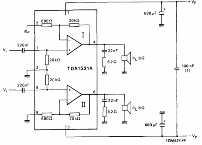 This amplifier for sound equipment was found in the Philips Databook of 1990. The circuit can be powered by a symmetric source of 7, .5 to 20 V. The integrated circuit must have a good heat radiator.