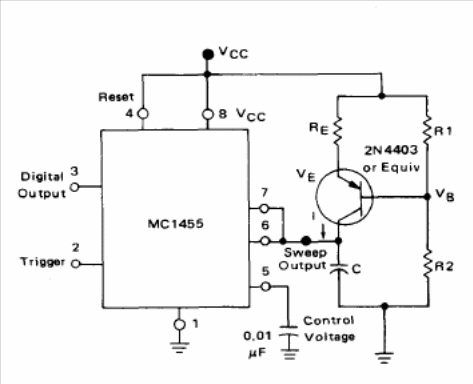 The integrated circuit used is equivalent to the 555 and the transistor can be the BC558. R1 and R2 determine the ramp. The circuit is suggested by the Motorola Linear Databook from 1990.