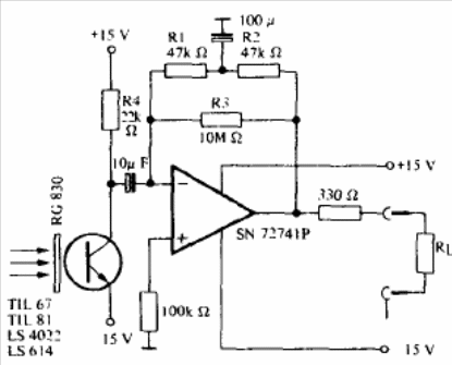 This circuit, which can be used on an optical link, is suggested by the Texas Instruments opto-electronics manual. The filter used in front of the phototransistor is of the infrared type. The feed must be symmetrical.