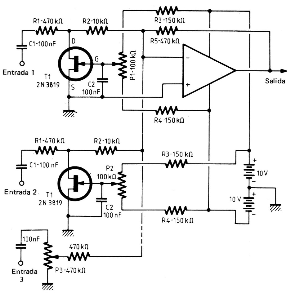 Operational amplifier such as the CA3140 or the TL series can be used in this circuit from a 1982 documentation. FETs can be equivalent as the BF245 or MPF102 and the power supply must be symmetrical. More inputs can be added to the circuit.