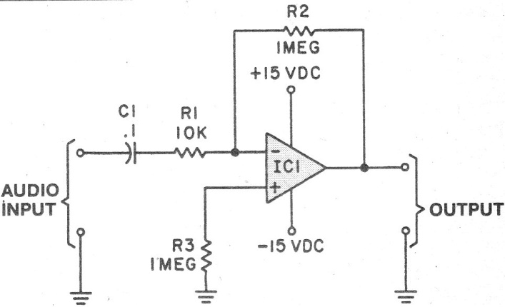 This is the traditional configuration of an inverter amplifier with 100 voltage gain and symmetrical power supply. The gain is given by the relationship between R2 and R1. The circuit is from an 80's documentation.