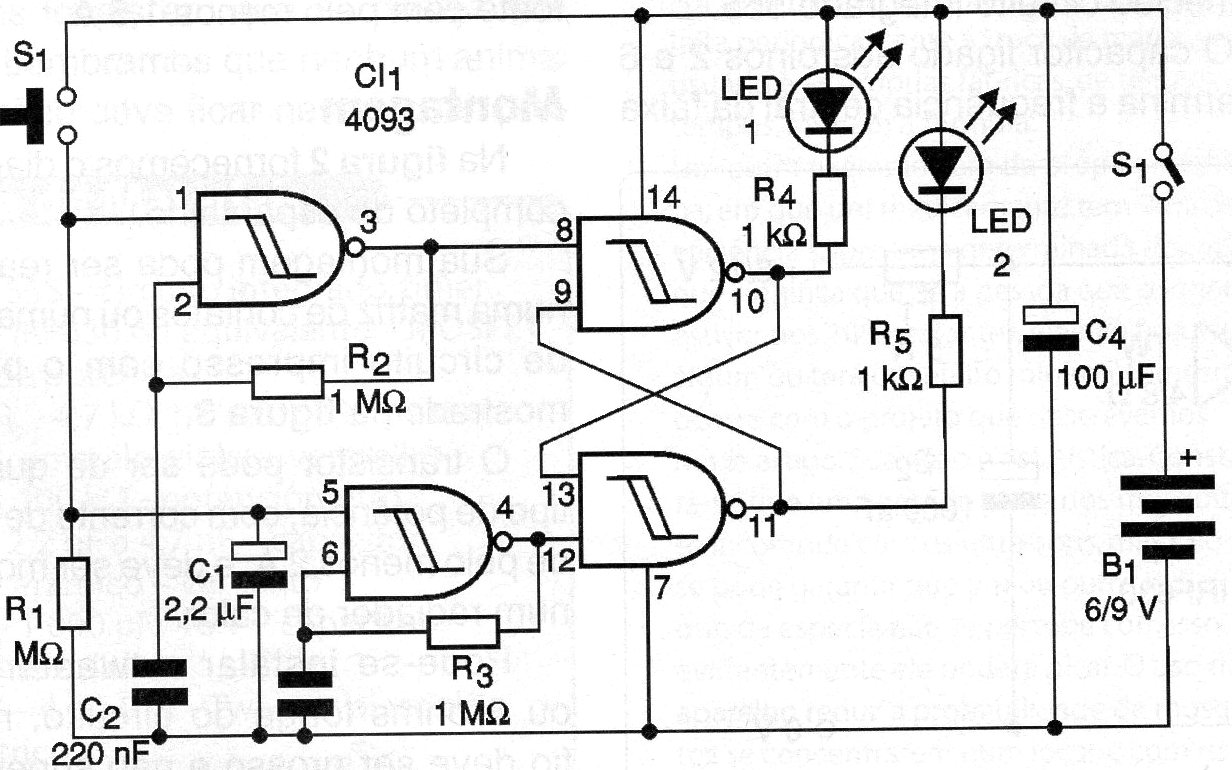 One touch of the push button S1 and the circuit LEDs shown in the figure start to flash rapidly. The blinking speed depends on R2 and C2. After a while, the LEDs stop flashing and only one of them remains lit, corresponding to the result of heads or tails. The circuit is powered by batteries and has a totally unpredictable behavior. It is not possible to get a result by controlling the time the switch is pressed. The time the LEDs flash depends on C1. The reader can change this component if he wishes. It will be interesting to use a red and a green LED so that the results are more easily differentiated. The assembly can be done on a common printed circuit board or in a contact matrix. There is also the possibility of using a single bicolor LED.