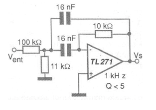 The circuit shown in the figure is suggested by Texas Instruments in its Linear Circuits Applications. It is a filter with a relatively low Q factor, less than 7. With the component values shown in the diagram, the tuned frequency is 1 kHz. Capacitors can be changed to tune to other frequencies. The values shown are components with low tolerances. If the application permits, commercial values may be used. The power supply is symmetrical and operational equivalent, with field effect transistors at the input can be used.