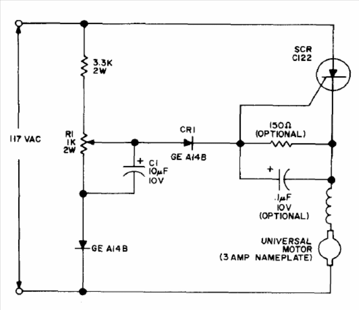 The circuit shown is from the 1977 GE semiconductor manual. More modern equivalent SCRs can be used. R1 must be wire type.