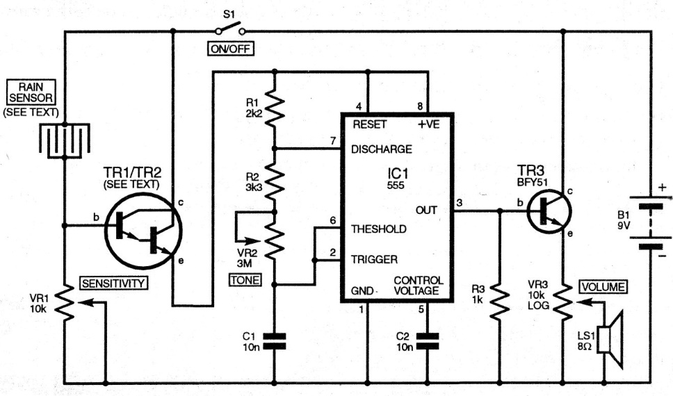 This alarm, from a 1996 magazine, can be fitted with two BC548s in the original configuration instead of TR1 / TR2 of the circuit. The alarm trigger time is set to VR2 while VR1 adjusts the sensitivity. The circuit will also operate on a 6 V supply.
