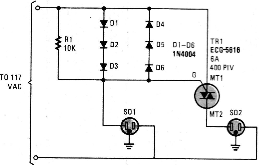 When the equipment powered by the SO1 socket is turned on, the SO2 socket is automatically energized, feeding the equipment connected to it. The diodes must have current according to what is connected to the sockets as well as the Triac. The circuit is from an American publication from 1991 but is still current. For 1N4004 the current is 1 A.