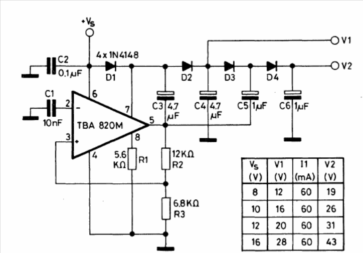 Datasheet of We found this circuit in the 1982 SGS Linear Integrated Circuits manual. A | table gives the obtained voltages, remembering that the output current is low. The circuit can be powered by voltages from 8 to 16 V with outputs from 19 to 43 V.