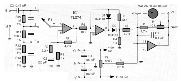 This sensitive millivoltmeter for alternating voltages was found in a French publication in 1996 but is still up to date due to the components used. Accuracy depends on the resistors of the input network. Instead of the indicator instrument, a current scale of a common multimeter can be used.
