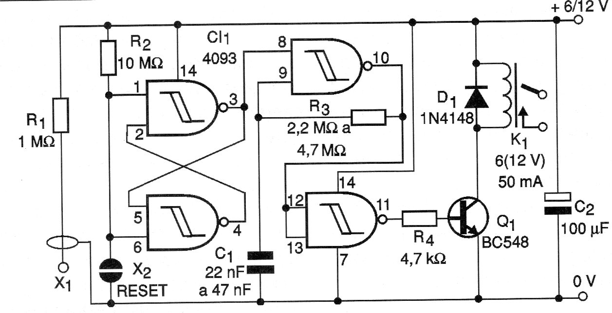 The circuit shown in the figure trips when a slight swing causes the pendulum to touch the ring that surrounds it, or if a touch sensor is used, when someone touches it. The circuit employs a bistable configuration of the 4093 so that, even if the touch of the sensor lasts for a fraction of a second, it switches and remains so indefinitely with the relay being activated intermittently. To reset the circuit, touch the X2 sensor for a moment. If a simple touch sensor is used, such as a piece of metal or the circuit is connected to an object, the zero-volt point must be grounded. The power can be done with batteries, battery, or source. If a source is used, it must be isolated from the power supply so that there is no shock hazard when touching the sensor. Resistor R1 must be increased to 10 M ohms if the touch sensor is used. The resistor R3, together with capacitor C1, determines the intermittence when the relay is activated.