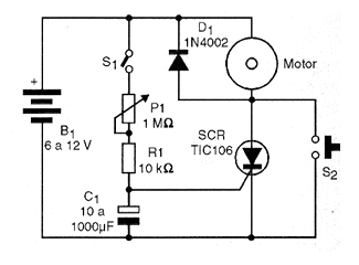 This circuit can be used as a time automation for driving motors in robotics and mechatronics. What we have in the figure is a circuit that delays the starting of the motor that occurs a certain time after switch S1 is closed. The time will depend on both the setting of P1 and the value of C1 which can be between a few seconds to a few minutes. Again, we have important points to note on this circuit. The first is that, once activated, to switch off, either open switch S1 or press S2 for an instant. The second is that the voltage drop on the order of 2 volts that occurs in the SCR while driving must be compensated. Finally, if the SCR is prone to an erratic shutdown or instability, a capacitor from 100 to 1000 uF must be connected in parallel with the motor.