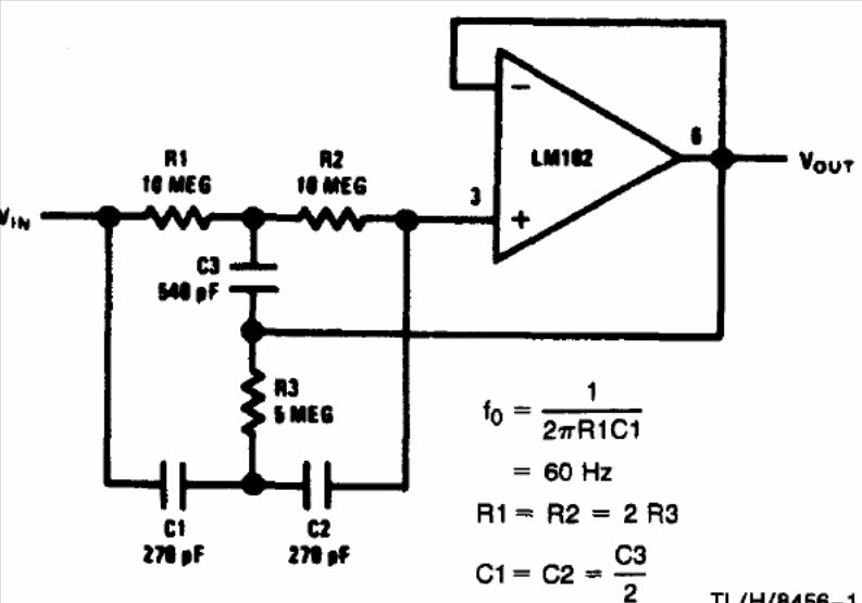 The presented circuit uses an uncommon operational amplifier but can be implemented with a more modern equivalent. The circuit is from the Linear Applications Handbook of National Semiconductor and must use a symmetrical source. The calculation of components for other frequencies can be done from the formulas next to the diagram.
