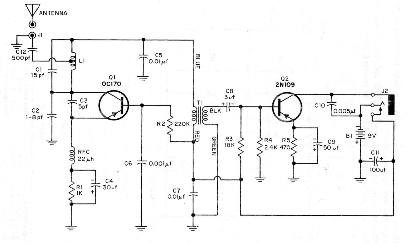 This receiver receives signals from the PX or Citizen Radio band at 27 MHz. The circuit is from an American publication from the 1960s and the critical component is the coil. The coil consists of 8 + 8 turns of wire 22 in the form of 1.5 cm without core. The transformer T1 is a transistorized radio (driver) and the output is in a high impedance phone.