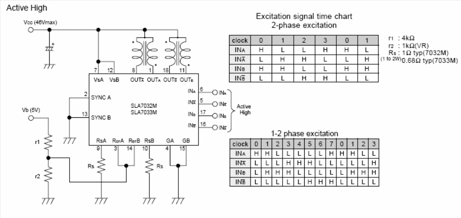 The circuit shown in the figure is suggested by Allegro Micro (www.allegromicro.com) and consists of an active stepper motor control at the high level. The circuit has input compatible with TTL signals and is active at the high level. More information on this and more application circuits can be obtained on the company's website. For the SLA7032M the maximum output current is 1.5 A and for the SLA7033M the maximum current is 3 A. For both, the maximum motor voltage is 46 V and the component is supplied in an 18-pin SIL housing.