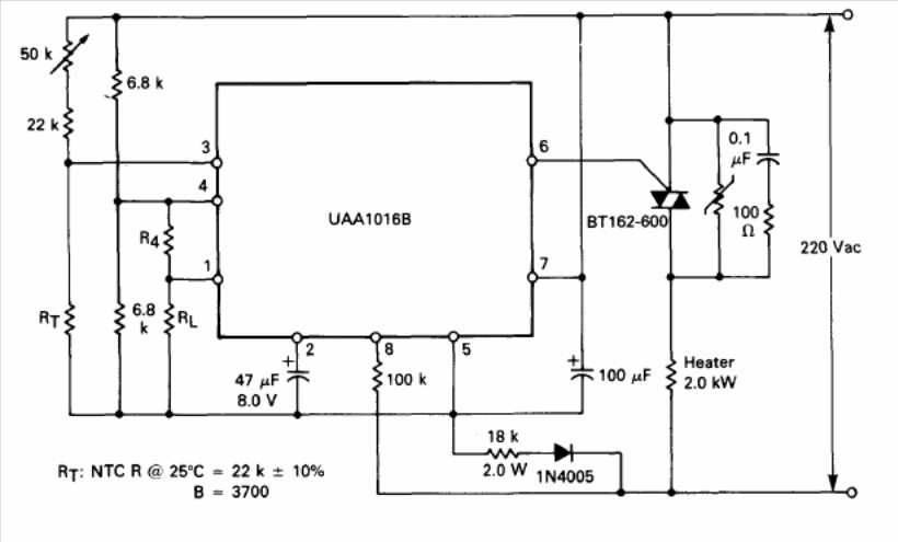 The integrated circuit used is from Motorola and the circuit from the 1990 Linear Databook. The component is not common, but the triac can be any of the TIC series depending on the controlled load.