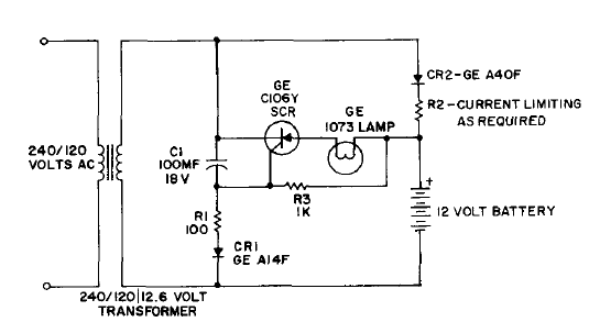We have already presented this configuration obtained from other sources. This is from GE's 1977 semiconductor manual. The SCR can be the TIC106 and the lamp according to the battery and the desired lighting.