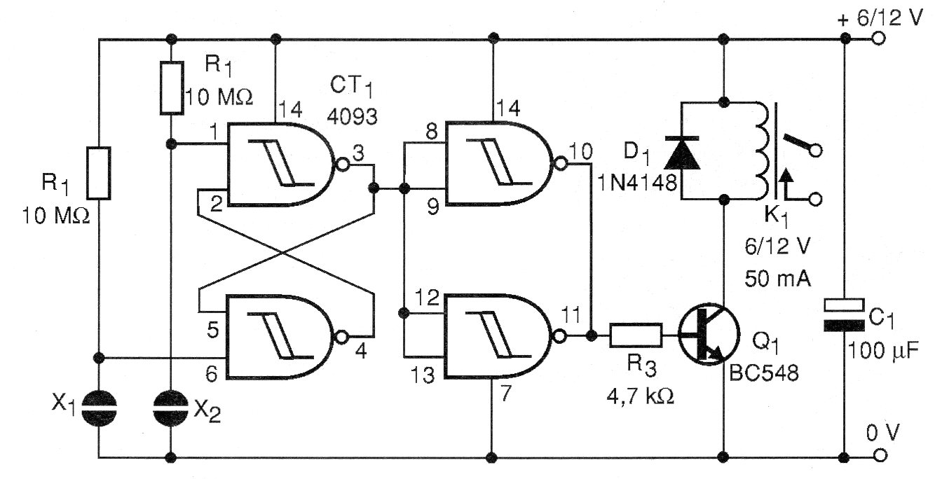 In a bistable circuit, as shown in the figure, we use two sensors. When one of them is touched, the circuit turns on and when the other is touched, it turns off. Resistors R1 and R2 determine the sensitivity and in this case the load consists of a relay with coil current up to 100 mA. The supply can be done with voltages from 5 to 12 V depending on the relay coil. A Darlington NPN can be used to directly control higher power loads. One possibility is the TIP110 for loads up to 1 A. The sensors are like to the one used in the previous project and there is also a recommendation to use an isolated source or battery in the supply. For assembly, both the common printed circuit board and the contact matrix option are available.