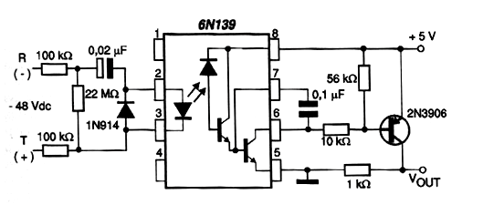 With the circuit shown in the figure, we have a logic signal to activate a calling device when there is a call signal on a telephone line. The circuit can be used to trigger a TRIAC or other power load fed directly through the power grid with complete isolation from the telephone line. Note that the power to the receiving sector is made with 5 V. The transistor 2N3906 is a general-purpose type and can be replaced by equivalents.