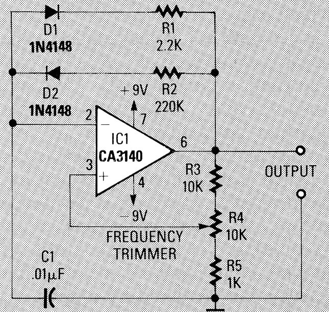 We found this circuit in a Radio Electronics from 1989. It is a common configuration in which you can control the active cycle of the generated signal, as well as its frequency. The power supply must be symmetrical.