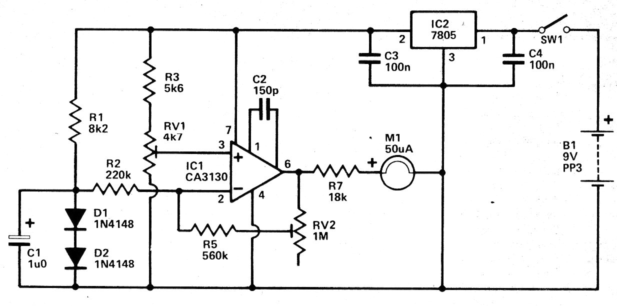 The sensor of this circuit consists of two 1N4148 diodes connected in series. The accuracy of the circuit will depend on the settings. The sensor can be remote. The indicator instrument is a 100 uA microammeter. This circuit was found this circuit in a 1979 documentation.