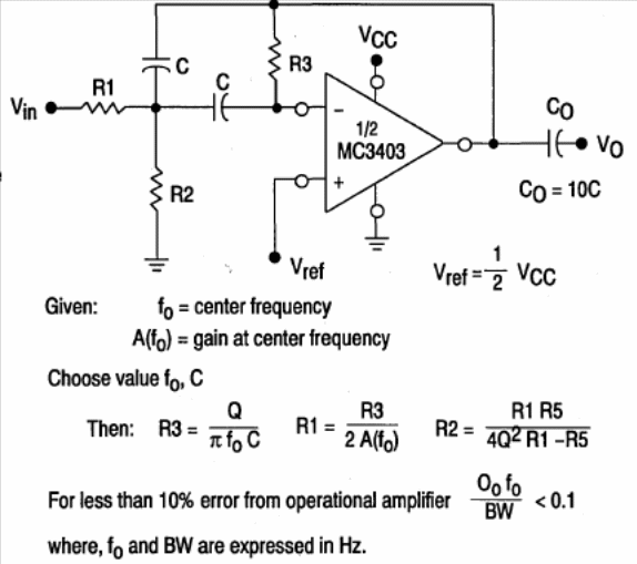 The operational amplifier used in this configuration is uncommon today, but more modern types can be used. The formulas next to the diagram allow you to calculate the components. The circuit is from Motorola's 1993 Linear Interface ICs.