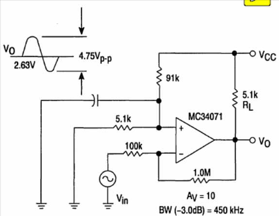 Other operational amplifiers series, such as MC34072, MC34074, MC35071, MC35072, MC35074 d MC33071 can be used in this configuration found on Motorola's 1993 Linear Interface ICs. The power supply must be symmetrical.