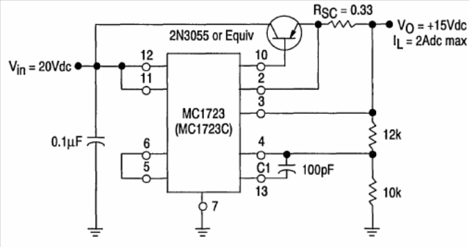 The LM1723 is the version of the well-known Motorola 723. The circuit is from Motorola's Linear Interface ICs from 1993. The transistor admits equivalents, with a PNP in the diagram is the NPN 2N3055.
