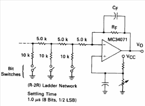 This low voltage, high speed converter with the MC34071 is suggested by the Motorola Linear Databook of 1990. The circuit must use a symmetrical source.