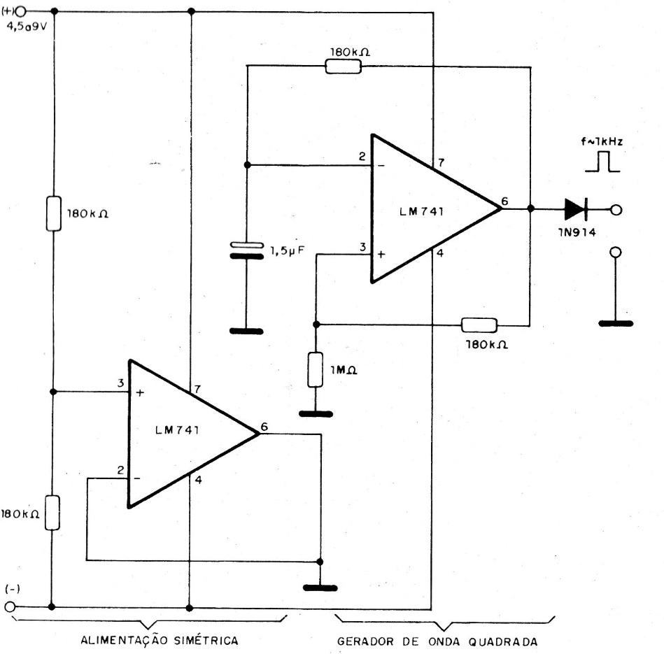 With the values of the components indicated, the circuit generates a 1 kHz signal. The power supply must be symmetrical and operational equivalent to 741 can be used. The capacitor can be changed to generate signals from other frequencies