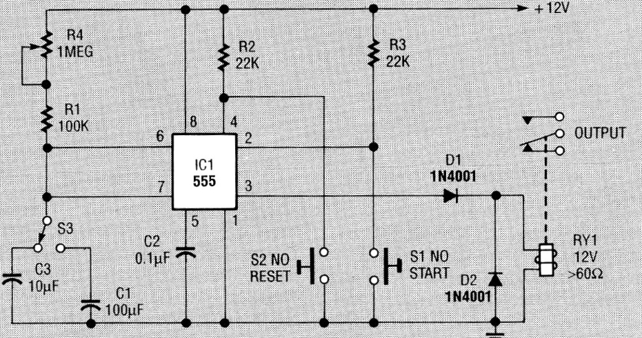 This circuit activates a relay at the end of the time delay. The indicated relay is of the low current type (up to 50 mA). If larger current relays are used, we recommend an amplification step. The circuit achieves times of a few minutes with C1 of 100 uF, but this component can be increased to 1,500 uF for times of the order of half an hour. The circuit is from a 2000 Poptronics.