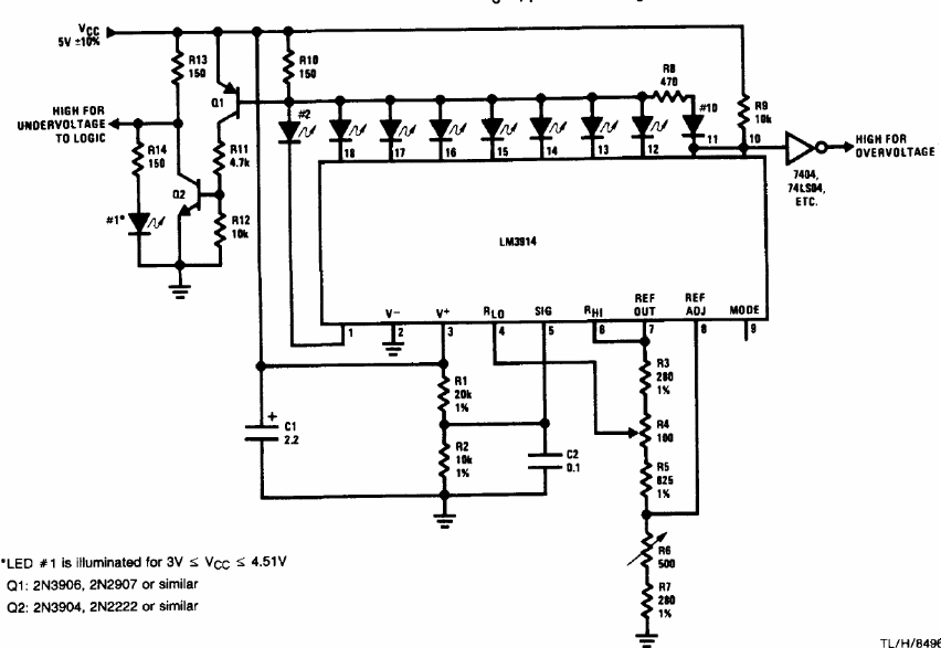 This circuit provides a logic output signal when the voltage exceeds a certain value. The circuit is from the 1994 Linear Applications Handbook by National Semiconductor.