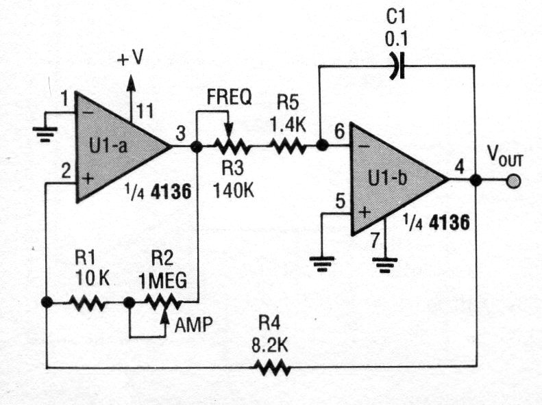 We found this circuit in a documentation from the 90's. The circuit can be assembled with 741 operational amplifiers. The power supply must be symmetrical and the frequency, which depends on C1, is adjusted in potentiometer P1.