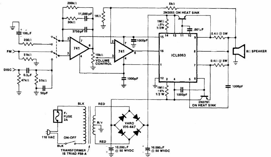 The integrated circuit and configuration are uncommon. However, the sound quality is good. The circuit is from the 1983 Intersil Databook. The output transistors must be provided with heat sinks.