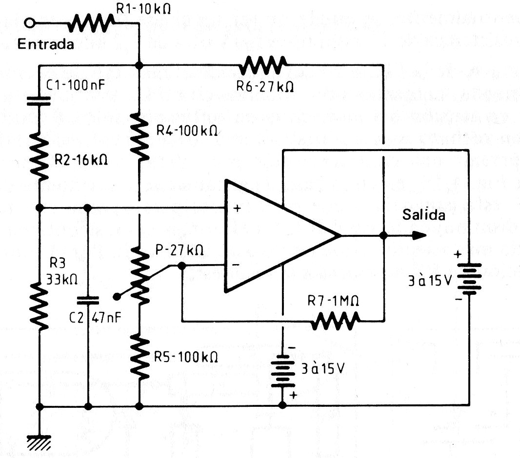 This filter that can use any operational was found in a French documentation from 1982. The power source does not have to be symmetrical and with the components used the frequency is 100 Hz. The potentiometer adjusts the operating point.