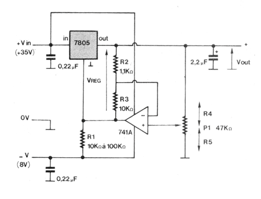 This circuit shows how to use a fixed 5 V regulator on a variable 1 A source. The integrated circuit must have a heat sink and a negative voltage source is required. We found the circuit in a French documentation from the 80s.
