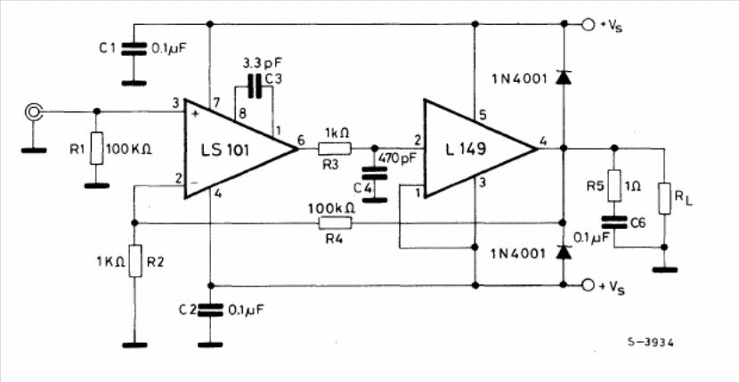 The components used in this configuration are not common today. The circuit is from the 1982 SGS linear integrated circuit manual. The power supply must be symmetrical. The circuit gain is 40 dB.